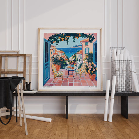 Step onto a sun-drenched terrace overlooking the breathtaking Côte d’Azur with French coastal wall art, a Matisse-inspired Mediterranean print that captures the essence of French Riviera living. Framed by lush greenery, citrus trees, and terracotta rooftops, this artwork pays tribute to vibrant colours, expressive brushstrokes, and timeless elegance.
