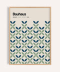 This blue and green wall art brings Bauhaus geometry into soft focus with repeating petal shapes in vertical alignment. Sage green and deep navy tones play gently against a cream background, forming a structured yet relaxed composition suited for modern interiors.