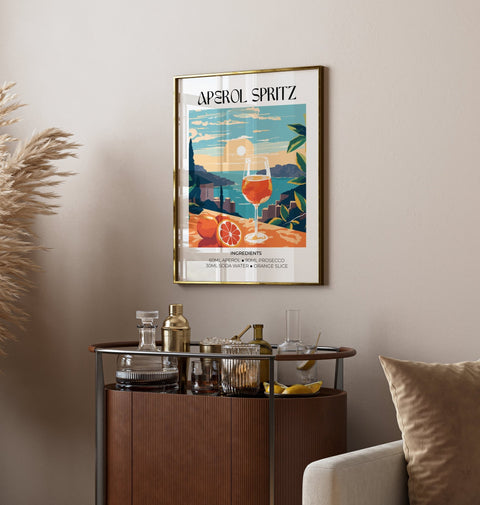 Inspired by cocktail art prints, the Aperol Spritz Cocktail Art Poster brings together the best of both worlds—fine art and mixology. With its rich orange tones reflecting the iconic Aperol hue, this piece is designed to brighten up any space. The swirling shapes and abstract forms evoke the fluidity of a summer evening, while the bold colours bring energy and vibrancy. For more curated home entertaining artwork, explore our Dining Room Wall Art collection.