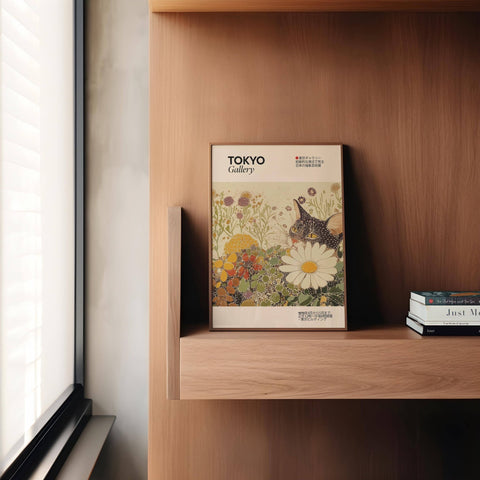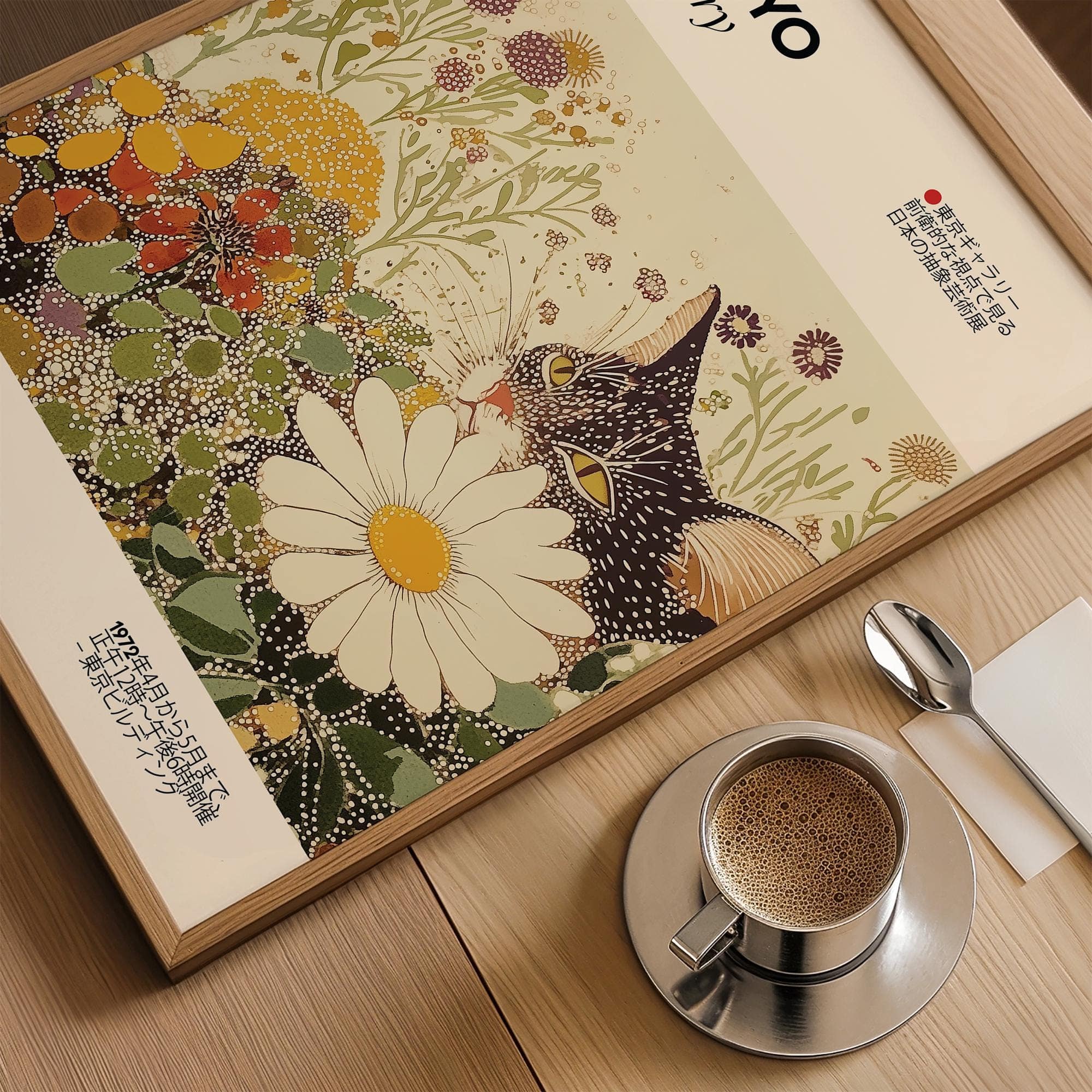 Inspired by Japandi art, this vintage cat wall art merges the beauty of nature with the mystique of feline elegance. Perfect for those who appreciate refined and meditative decor, this print adds depth and character to any interior space.