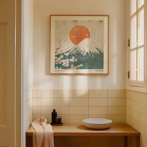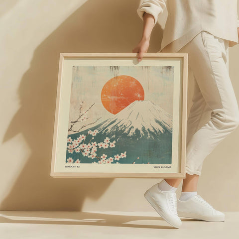 Escape to the serene beauty of Japan with this Square Print, featuring the iconic Mount Fuji alongside a retro-style sun and delicate cherry blossoms. This artwork captures the harmony of Japanese landscapes, creating a tranquil and elegant atmosphere in any setting. It also fits beautifully within our curated Japanese wall art collection.