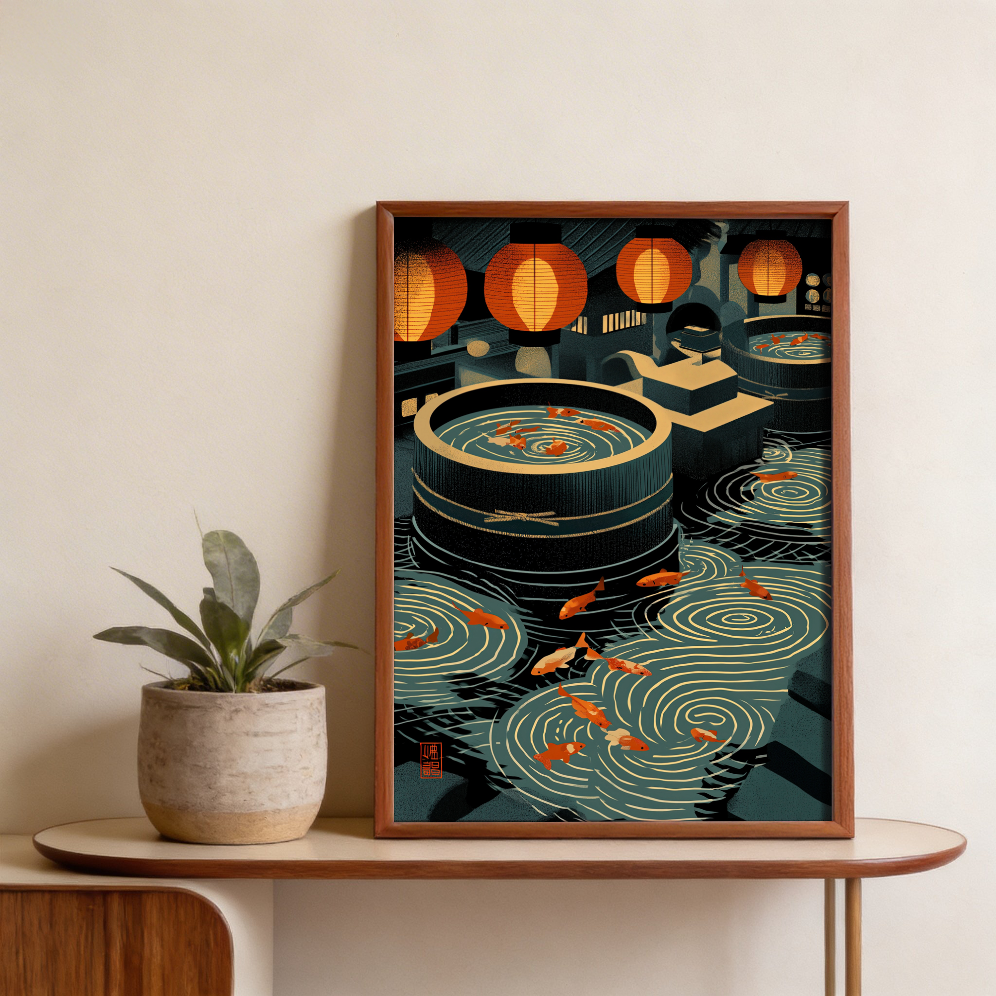 Use this Japanese Koi Art Print to add structured calm to a hallway, office, or living area, especially where linear furniture benefits from a strong horizontal flow. The detailed ripples and lantern silhouettes also make the Japanese Koi Art Print a good choice for a curated gallery wall with graphic illustration pieces. Note: Frame not included.