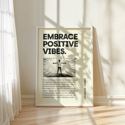 Elevate your space with this motivational quote poster, a bold and inspiring typography print designed to bring positivity and encouragement into your daily routine. Featuring the uplifting quote "EMBRACE POSITIVE VIBES" in striking black typography against a soft cream background, this artwork serves as a daily reminder to stay motivated and embrace optimism. Whether displayed in a bedroom, office, or creative space, this poster adds an inspiring and contemporary touch to any interior.