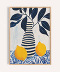 This lemon art print captures the brightness and freshness of citrus with bold, painterly detail. Featuring two vibrant yellow lemons set against a patterned blue tablecloth, the composition is anchored by a striped vase and surrounded by deep navy foliage. The contrast of warm and cool tones creates a balanced design that feels both lively and refined.