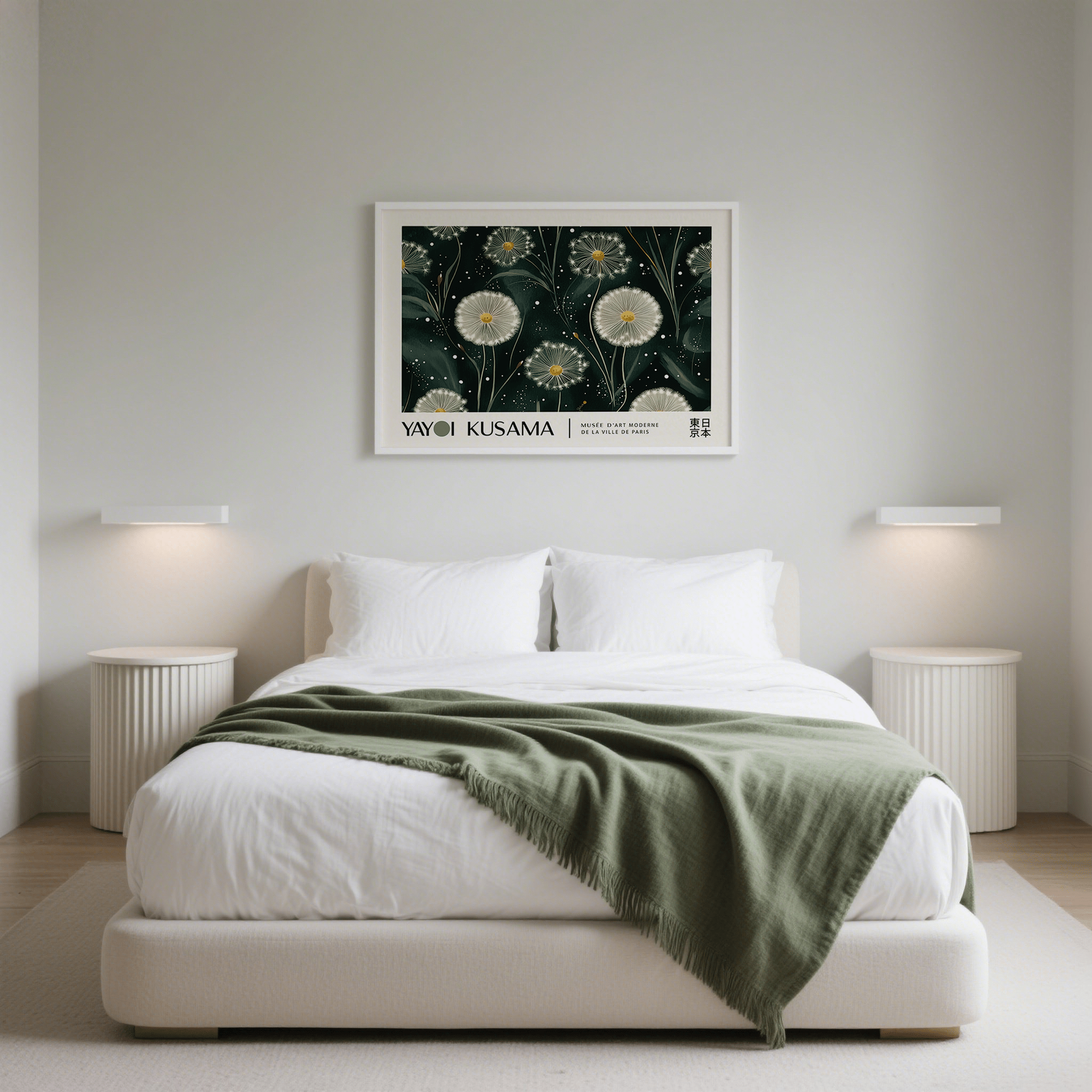 Porta un tocco di natura ed eleganza nel tuo spazio con questa opera d'arte da parete verde smeraldo, una suggestiva stampa di denti di leone ispirata allo stile intricato e accattivante di Yayoi Kusama. Caratterizzata da denti di leone luminosi con centri dorati su uno sfondo verde smeraldo intenso, quest'opera d'arte fonde perfettamente elementi botanici e arte astratta. L'equilibrio tra forme organiche e contrasti audaci la rende un pezzo di spicco in qualsiasi interno moderno.