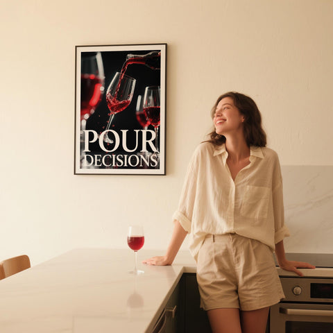 Looking for a clever gift for wine lovers? This cheeky wall print brings together humor and style with its bold “Pour Decisions” message and rich red wine pour set against a sleek black background. A perfect fit for kitchens, home bars, or dining rooms, it offers a modern take on wine appreciation with a playful twist.
