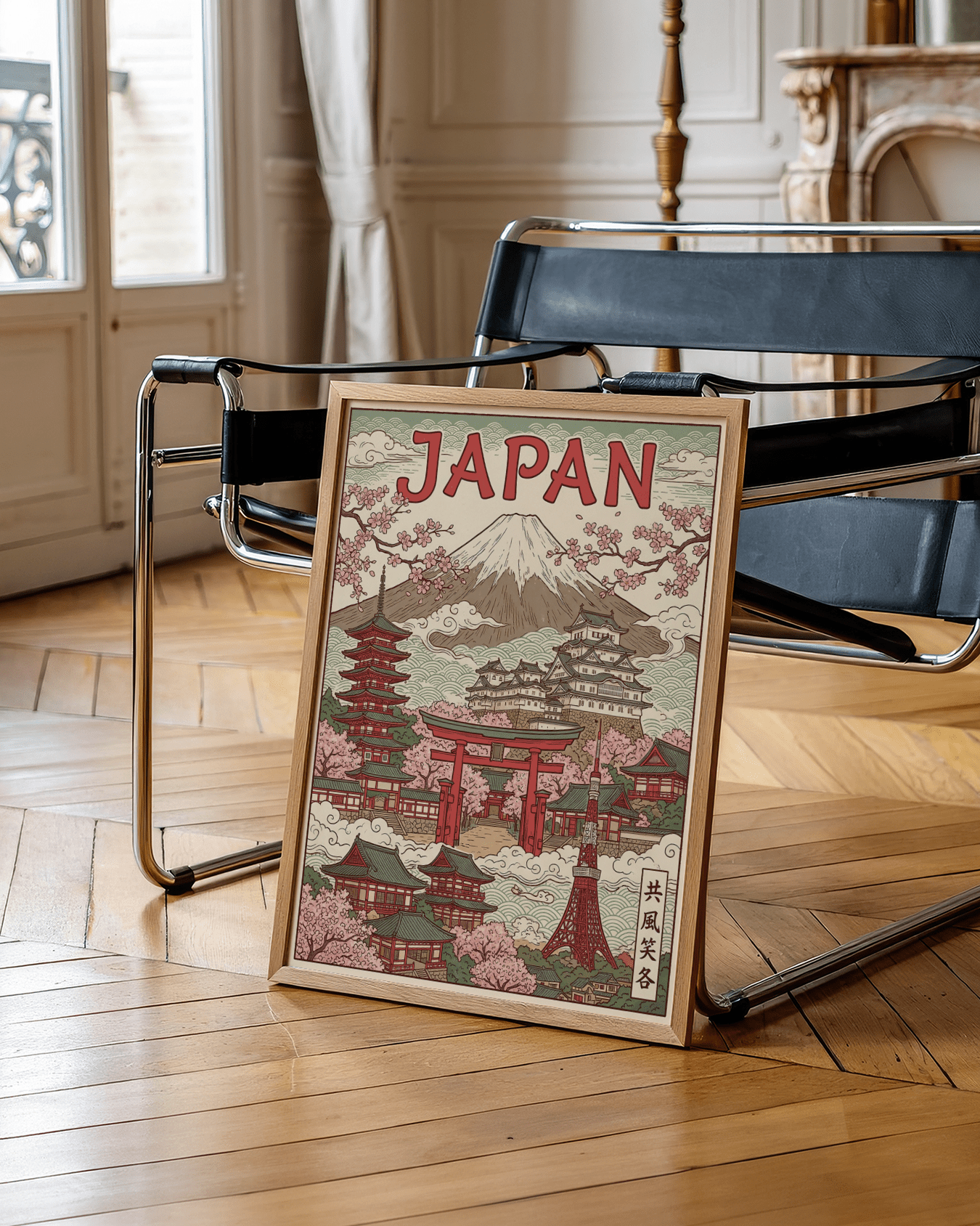 This Japan Art Print beautifully brings together classic Japanese scenery and architectural icons, making it a timeless addition to your space. Featuring Green, Pink, Red, and Beige, this art print captures the vibrant spirit of Japan through detailed illustrations of traditional pagodas, cherry blossoms, and striking Torii gates. The vivid colors create a calming and harmonious atmosphere, making it ideal for those seeking to infuse their walls with culture and refined taste.